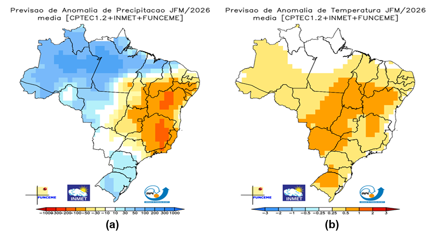 Figura 3: Previsão de anomalias de (a) precipitação (mm) e (b) temperatura média do ar (°C) para o trimestre janeiro, fevereiro e março/2026, elaborada conjuntamente pelo INMET, CPTEC/INPE e FUNCEME.
